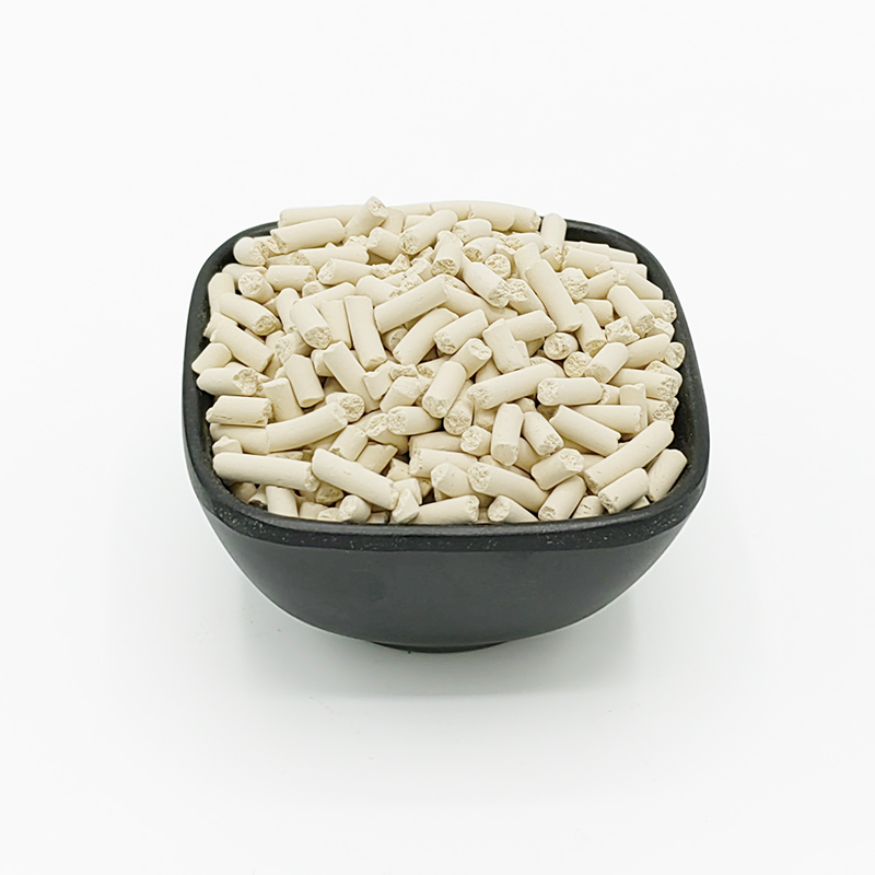 4A分子筛是一种碱金属硅铝酸盐,其分子式为Na2O·Al2O3·2SiO2·9/2H2O。具有强度高、磨耗低、吸附容量大、稳定性强等特点,能吸附H2O、NH3、H2S、SO2、C2H5OH、C2H6、C2H4等临界直径不大于4A的分子,是工业上用量较大的分子筛品种之一。
