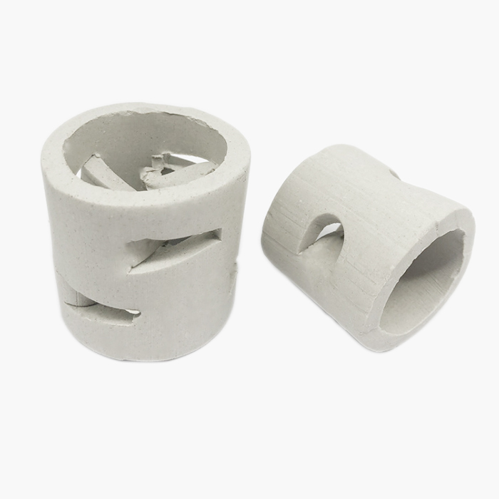 陶瓷鲍尔环填料是在陶瓷拉西环的基础上开发的一种高径相等的开孔环型填料,每层窗孔有5个舌叶,每个舌叶内弯指向环心,上下两层窗孔的位置相反错开,一般开孔面积约占环壁总面积的30%左右,使得填料塔内的气体和液体能够从窗孔自由通过,改善了气液分布,充分利用了环的内表面。