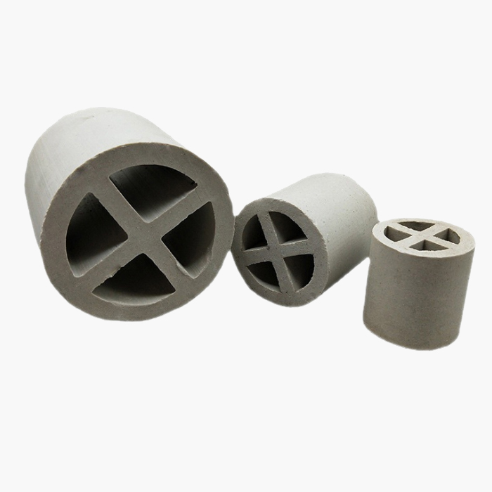 陶瓷十字隔板环填料是基于增加填料的比表面积,从而强化传质效率而开发出来的。 其形状是在拉西环中间增设了十字隔板。 一般来讲,这种填料由于尺寸较大,仅适用于整体堆彻,目前一般只作为乱堆填料的塔底支撑分布层用。