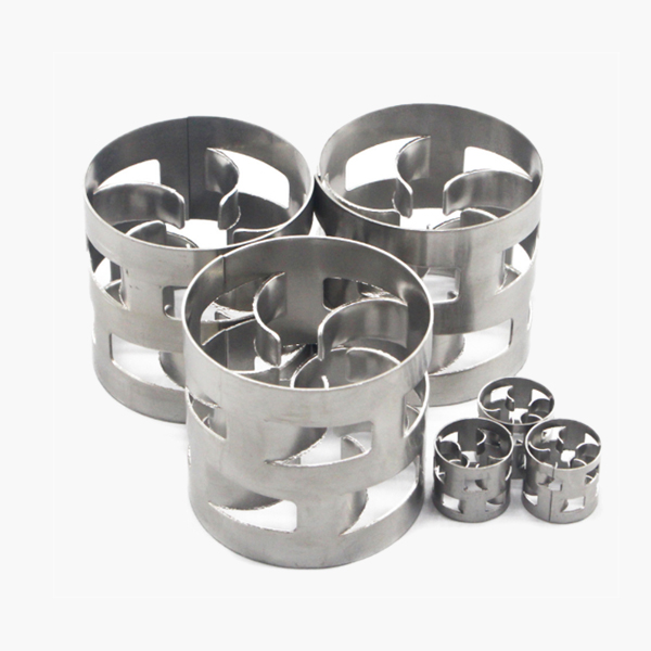 金属鲍尔环填料是采用金属薄板冲制而成,在环壁上开出了两排带有内伸舌叶的窗孔。每排窗孔有五个舌叶,每个舌叶弯向环内,指向环心,在中心处几乎相搭,上下两层窗孔的位置相互错开,一般开孔的总面积约为整个环壁面积的35%左右,由于鲍尔环填料在环壁上开了许多窗孔,使得塔内的气体和液体能够从窗口自由通过,目前鲍尔环填料是被采用的主要环形填料之一。